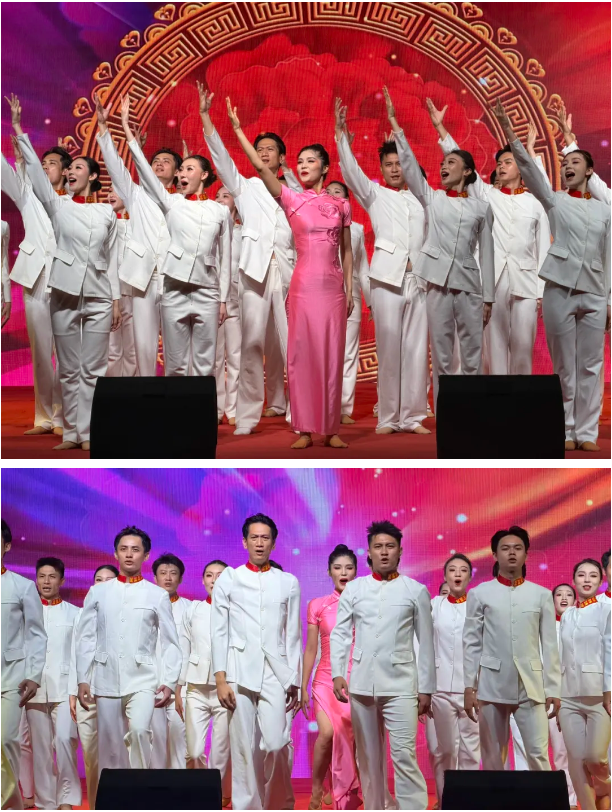 全体演员携手献礼,激昂的旋律、整齐的舞姿,