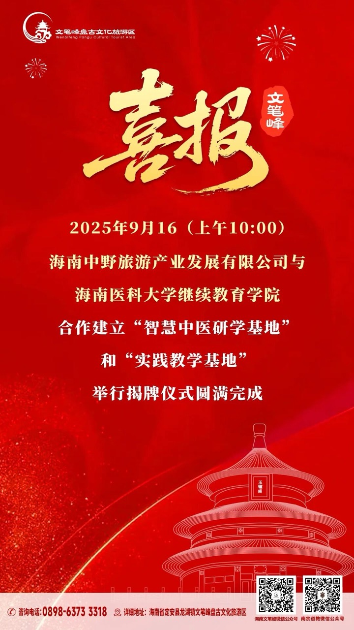 此次揭牌仪式标志着海南中野旅游产业发展有限公司与海南医科大学继续教育学院在中医实践、中医研学领域深度合作的正式开始,为双方共同推动海南地区中医药人才培养、传统文化传承以及产学研协同发展奠定了坚实基础。与此同时,海南中野旅游产业发展有限公司将继续深化与海南医科大学继续教育学院的产学研协同融合,助力中医药文化创新传播与实践落地;依托海南得天独厚的生态优势与文笔峰独特的资源禀赋,双方将持续携手赋能健康产业发展,让中医药这一中华瑰宝在新时代焕发更强生机,为海南自贸港建设及全国中医药事业高质量发展贡献更多力量。文笔峰的明天必将因健康产业的赋能而越来越好!期待与海南医科大学继续教育学院携手并进,共创美好未来!福寿康宁。
